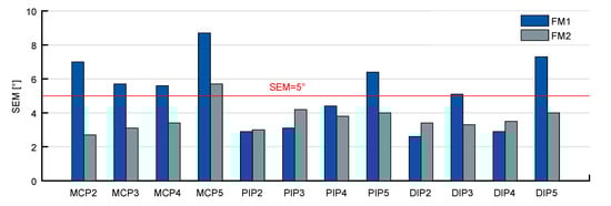 Overall, the SEM was 5.1° (SD 1.9°) and 3.7° (SD 0.7°) for the marker set with one and two markers per segment, respectively, calculated over all subjects and finger joints. The SEM for each joint is compared between the two methods in Figure 4. The error exceeded 5°, which is set to be the limit for clinical relevance, in seven out of twelve joints for FM1 and only in the MCP5 for FM2.