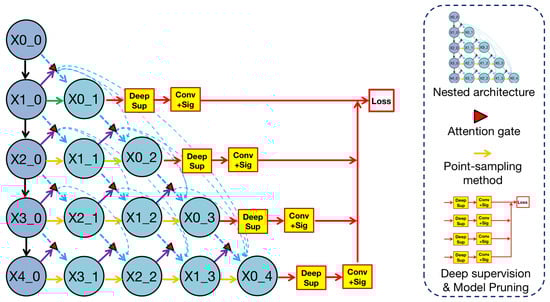 The nested architecture can extract features of different depths. The deep supervision (Section 3.4) allows the network to spontaneously select the features that are most suitable for the task, thereby avoiding a complex selection of features. In addition, the attention mechanism (Section 3.2) and the point-sampling method (Section 3.3) can be integrated in this architecture.