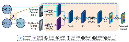 To help the model better strengthen the learning of the target region, an attention-aware module was added to the network. This module was designed by Oktay [] and named Attention gate. The details of the Attention gate are analyzed in Algorithm 1.