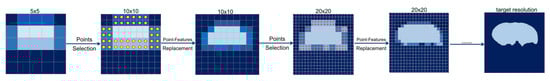 Images can be regarded as regular grids of pixels (points). Their feature vectors are hidden representations on the regular grid. Pixels upsampled uniformly on the hidden representations are mapped to a set of labels. The rendering method does not calculate the labels uniformly on the hidden representations. Rather, it adaptively selects uncertain points from all pixels of the image to calculate the labels. We adopted the idea of the classic subdivision [] strategy. This strategy calculates only those locations where the values are significantly different from their neighbors. The values at other locations are obtained by interpolating the existing results. This process, which we call the point-sampling method, computes masks from low resolution to high resolution by selecting uncertain points. We used the proposed point-sampling method to solve the boundary blur problem. The point-sampling method consists of the following steps: