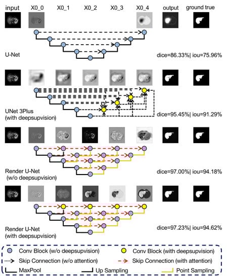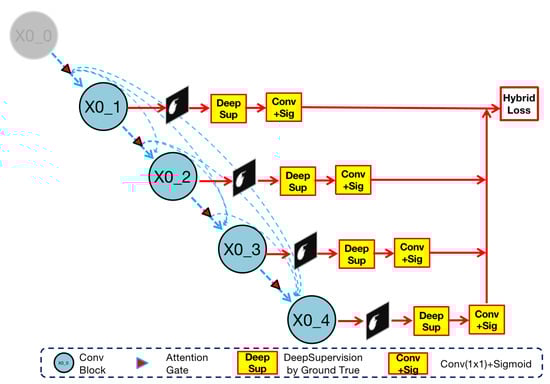 To improve convergence speed and solve the problem of gradient disappearance, deep supervision was first proposed in []. In our work, deep supervision was introduced to supervise the semantic information collected by the nested architecture. Figure 6 shows how deep supervision is implemented in Render U-Net.