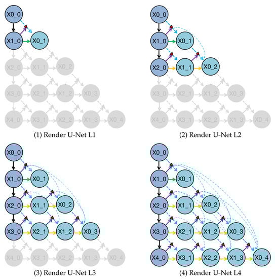U-Net and its variants are the popular backbone in semantic segmentation experiments. UNet++ [] and ANU-Net [] are two representative architectures. The nested U-Net architecture of Render U-Net referred to these works. The structure of the Render U-Net is shown in Figure 2.