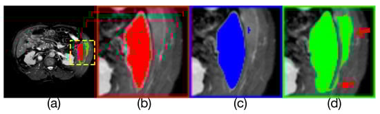 Similarly, Table 3 compares the spleen segmentation performance on MRI images, where Render U-Net had the best performance. The output of the model and the manually annotated result are compared in Figure 10. Our proposed network increased mIoU by over 0.1672 [], and increased the Dice coefficient by 0.0981, increased precision by 14.98 percentage points, and increased the recall rate by 4.29 percentage points.