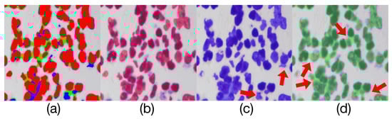Table 6 compares the nuclei segmentation performance, where Render U-Net had the best performance. The output of model and the manually annotated result are compared in Figure 13. Our proposed network achieves IoU that increased over 0.1504 [], and the Dice coefficient increased by 0.0951, the precision decreased 11.68 percentage points, and the recall rate increased 8.18 percentage points. It is also worth noting that U-Net also performs well in nuclei segmentation tasks. In particular, because U-Net has a simpler model, it is more suitable for such task.