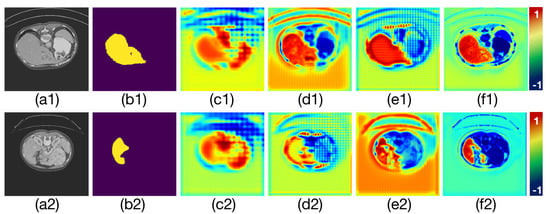 The graph of the attention coefficient changing with training. The color change in the figures represents the change in the weight of attention learning, where red represents enhancement and blue represents inhibition. (a1–f1) is the first group of changes. (a2–f2) is the second group of changes. (a1,a2) are the input CT images. (b1,b2) are the ground truth of liver, respectively. (c1–f1) and Figure (c2–f2) are two groups of the attention coefficients in different training phases.