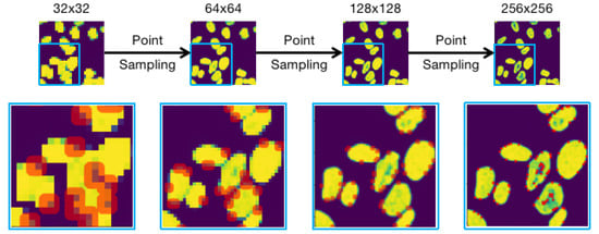 As we can see, during point-sampling, our network selected a set of uncertain points and calculated masks from low-resolution (32 × 32) to high-resolution (256 × 256). Compared with the traditional upsampling method that calculates full-resolution points (256 × 256 = 64 K), the point-sampling method can extract boundary information by using only a few points for prediction (8096 × 3 = 24 K), thereby assisting the overall segmentation task and reducing computational overhead.