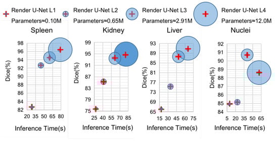 Diagram of the relationships between the Dice coefficients and inference times of the four pruned Render U-Nets with segmentation of four kinds of objects. We use four blue circles with different areas to denote sub-networks with different parameter amounts.