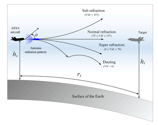 Recent dramatic advances in radar systems have resulted in the extensive use of a variety of long-range airborne radars, including active electronically scanned array (AESA) radars, synthetic aperture radars (SARs), and airborne early warning (AEW) radars [1,2,3,4,5,6]. Such radars are generally required to exhibit extreme high-performance in order to accurately detect long-range targets in the case of even a low radar cross-section (RCS). However, regardless of the radar performance, the target detection probability can be decreased by various factors, for example, external noise, clutter, atmospheric gas attenuation, polarization mismatches, multipath interference, and the atmospheric refractive index [7]. In particular, the gradient of the atmospheric refractive indices along the altitude usually changed by the temperature, atmospheric pressure, and dew-point temperature, causes the refraction of the wave propagation, that is, sub-, super-, normal-, and duct refraction. These propagation characteristics make it difficult to estimate the long-range target position [8], and it is essential to model the atmospheric refractivity along the altitude to precisely predict the propagation direction, path loss, and propagation factor. Thus, many studies involving the modeling of atmospheric refractive indices at low altitudes of less than 1 km have been conducted by estimating the duct phenomena through the measured path loss values [9], the clutter power values [10], and statistical analyses based on stored atmospheric data [11]. In addition, various studies have also been carried out to estimate the wave propagation characteristics when considering the oversea atmospheric characteristics in ground-to-air and ground-to-ground scenarios. For example, substantial low-altitude atmospheric data concerning certain coastal areas in the United States, Europe, and China have been used to analyze the path loss for wave propagation characteristics. Although previous studies have shown a sufficient analysis of the radar propagation characteristics in a low-altitude situation, it still needs in-depth research regarding the propagation characteristics at high altitudes of over 5 km in air-to-air situations considering the atmospheric effects.