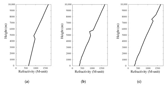 In general, the atmosphere is usually expressed by the refractive index n according to the height, and it can be changed into the modified refractive index M on a hypothetical flat Earth when considering the Earth’s curvature, as expressed in Equation (1) [14].