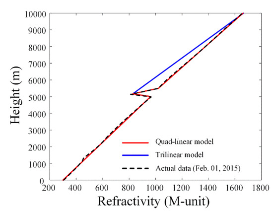 Figure 4 presents comparisons of the quad-linear and trilinear modeling of the actual refractivity data obtained at the Osan meteorological observatory on 1 February 2015. The detailed values of the quad-linear model parameters are h1 = 4.98 km, h2 = 5.16 km, h3 = 5.5 km, hmax = 10 km, d1 = 132.5, d2 = −817.8, d3 = 587, and d4 = 142. The quad-linear modeling result exhibits a good level of agreement with the actual refractivity data when compared with the conventional trilinear model result, where the deviations of each model can be calculated by the equation as follows: