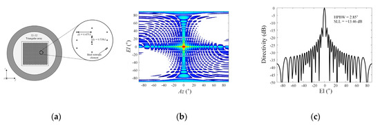 Array antenna characteristics of the air-to-air airborne radar: (a) 32 × 32 triangular array antenna configuration and array distance; (b) 2D array pattern in the Az/El domain; (c) directivity pattern at the bore-sight direction in the H-plane.