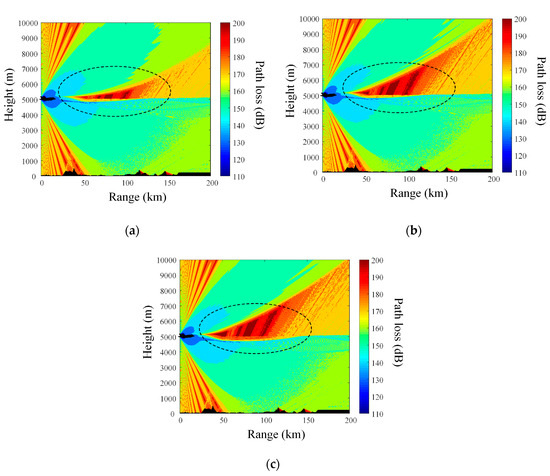 The Advanced Refractive Effects Prediction System (AREPS) simulation results of path losses employing the linear models and the actual data regarding the modified refractivity: (a) trilinear model; (b) quad-linear model; (c) actual data.