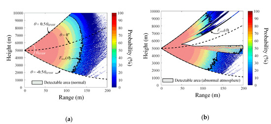 Detectable area according to the target detection probability: (a) normal atmosphere; (b) abnormal atmosphere.