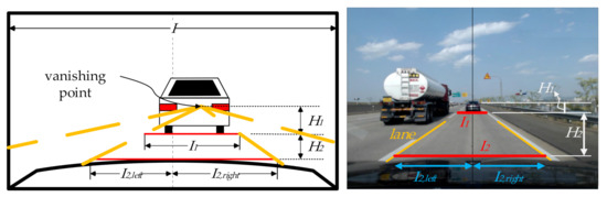 In Figure 1, I1 is the lane width determined from the bottom of the rear tires of the lead vehicle; I2,left and I2,right are the distances from the central vertical line of the image to the left and right lanes, respectively; H1 is the vertical distance from the vanishing point to the bottom of the rear tires of the lead vehicle; H2 is the vertical distance from the bottom of the rear tires of the lead vehicle to the hood of the camera-equipped vehicle.