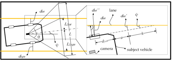 In Figure 3, dleft and dright are the distances from the left and right tires of the camera-equipped vehicle to the lane, respectively; df.wh is the distance from the front tire to the front bumper of the vehicle; k is the distance from the endpoint of a to the lane; ψ is the heading angle between the vehicle and lane; θ is the camera angle of view; L is the lateral distance across the front-view of the image with respect to the hood top.
