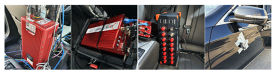 The devices used for the recording measurements during the real vehicle test included the RT3002 inertial navigation system, RT-range ADAS sensor, SIRIUS data acquisition device, and a camera. The devices mounted on the test vehicle are shown in Figure 5, and their specifications are listed in Table 2. The RT3002 system measures the vehicle dynamic characteristics based on differential GPS data, and the RT-range sensor measures the distance to the lead vehicle. SIRIUS collects the data measured from RT3002 and RT-range, and the camera measures the distance from the front tires to a lane.