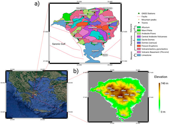 Figure 1. (a) Simplified geological map of the Methana peninsula, Greece (modified after [21,22,23]), with indication of Global Navigation Satellite System (GNSS) stations and local benchmarks and (b) topography from a 5.5-m resolution digital surface model by the Hellenic Mapping and Cadastral Organisation.