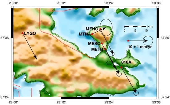In early 2015, a continuous GNSS (cGNSS) station was also established in the Lygourio (LYGO) close to Methana peninsula as part of the HxGN SmartNet (https://gr.nrtk.eu/), that, ever since, has acted as local reference station. In addition, since August 2019, cGNSS data were available from a station (MTNA) located in the western part of Methana peninsula as part of the GNSS network of the Institute of Geodynamics, National Observatory of Athens (NOA). Horizontal velocity results from two more cGNSS stations were also available from the National Technical University of Athens (NTUA), i.e., station METH installed in 2004 in the southern sector of Methana peninsula, and from [55], i.e., station 010A located to the south-east of Methana peninsula, at Poros.