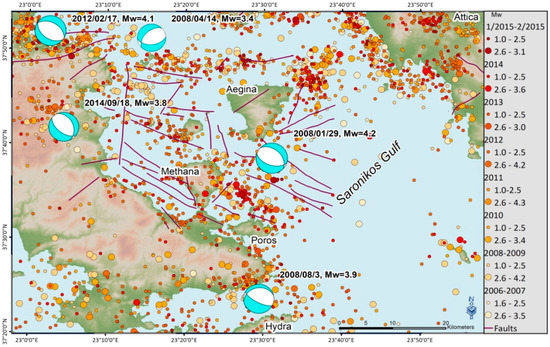 The Saronic Gulf constitutes a neotectonic basin which was created 4–5 million years ago [27,28]. NE-SW normal faults dominate the broader region, while N-S, E-W and NNE-SSW striking normal faults are also recognizable in the area [25] and are characterized by low seismic activity, chiefly with shallow events [29].