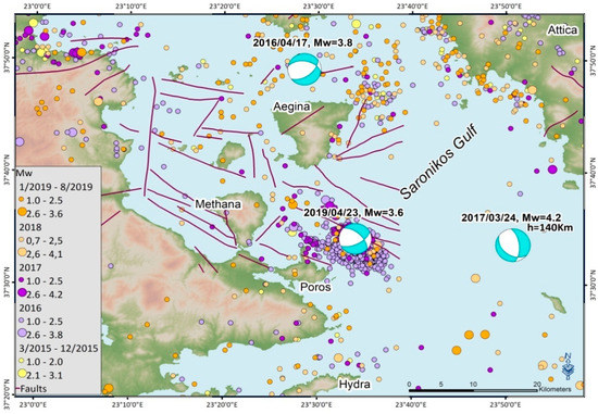 For the period 2015–2019, there were three significant seismic events in the area: two moderate shallow earthquakes with magnitudes Mw = 3.8 and Mw = 3.6 and a very deep one (depth = 142 km) with magnitude Mw = 4.2 (Figure 5). In this period, a significant seismic swarm was observed NE of Poros Island. The seismic activity in this cluster started in 2016 and continued with few events up to 2019. Additional to the surface seismicity, very deep (80–100 km) sporadic micro-events took place on a wider area extending from Methana towards Hydra Island. These deep micro-events may be attributed to the NE-subduction zone of the Ionian oceanic plate that reaches very deep in this area [5,54,59,60].