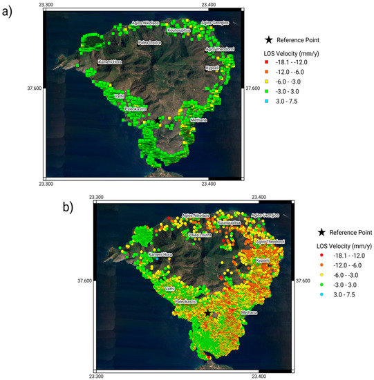 The maximum VLOS away from the sensor (i.e., negative values) that is observed after calibrations is −8.5 mm/year from the PS dataset and −18.1 mm/year from the DS dataset (Figure 6). PS and DS with the strongest movement away from the sensor are located on the eastern flank of the peninsula. Considering the ascending mode-looking geometry and the orientation of the LOS, this could plausibly indicate the occurrence of downslope mass movements. Compared with the topography displayed in Figure 1b, these movements concentrate on the volcanic ranges and gully erosion landforms above the urban settlements of Methana, Kipseli, Agii Teodori and Agios Georgios. Photo interpretation using Google Earth imagery, however, did not highlight changes of specific landforms for the 2012–2019 period.