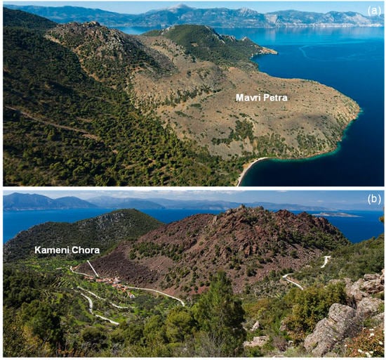 Figure 7. (a) Aerial view of the Mavri Petra andesitic dome and (b) details from the south-east, including Kameni Chora village (photographs © TobiasSchorr@Methana.de).