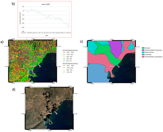Figure 8. (a) LOS deformation velocity in 2015–2019 from the MT-InSAR analysis, (b) example of time series for a PS located on limestone, (c) geology/lithology and (d) urban footprint of Methana town: (a,c,d) are overlapped onto satellite optical imagery (© 2020 TerraMetrics, © 2020 Google).
