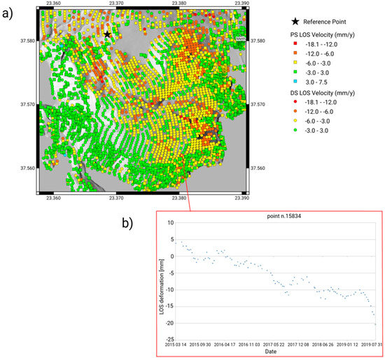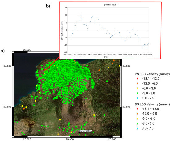 Figure 10. (a) LOS deformation velocity over Mavri Petra in 2015–2019 from the MT-InSAR analysis overlapped onto satellite optical imagery (© 2020 TerraMetrics, © 2020 Google) and (b) example of time series for a PS located in the NW portion of Mavri Petra.