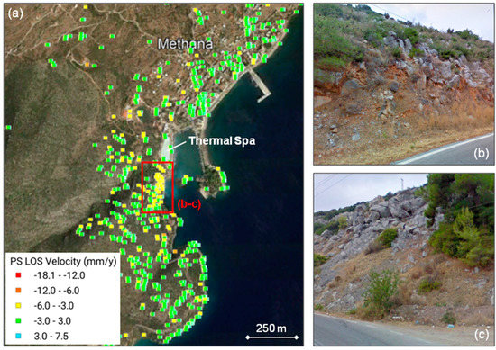 Figure 12. (a) LOS deformation velocity of the PS over Methana town in 2015–2019 from the MT-InSAR analysis overlapped onto satellite optical imagery (© 2020 TerraMetrics, © 2020 Google) and (b,c) ground-truth photographs of rock-fall accumulation along the Methana–Taktikopolis road (© 2020 Google).