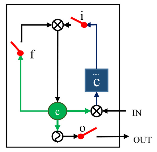 The architecture of LSTM module. Here, i is the input gate, f is the forget gate and o is the output gate. c is the cell state and is the update cell.