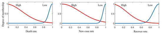 Fuzzy membership functions for death rate, case rate, and recovery rate.