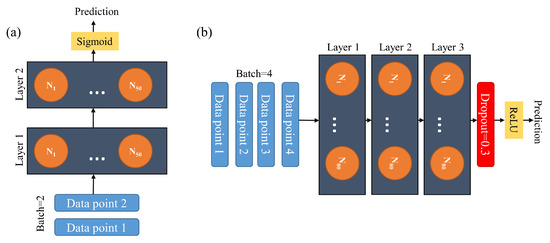 Examples of generated LSTMs. (a) LSTM with two hidden layers, 50 hidden units in each layer, batch size 2, and sigmoid activation function. (b) LSTM with three hidden layers, 80 hidden units in each layer, batch size 4, dropout 0.3, and ReLU activation function.