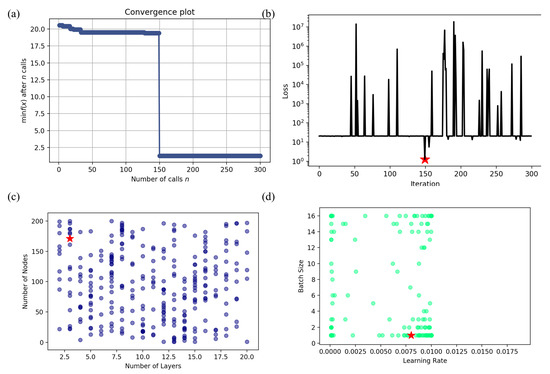 Results for the USA dataset. (a) minimum validation accuracy over iteration, (b) loss over iteration, distribution of (c) number of layers and hidden nodes, and (d) learning rates and batch size. (The red stars represent optimum value)
