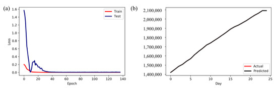 Case study of the network training for USA. (a) training loss during training, and (b) active case prediction on validation data.