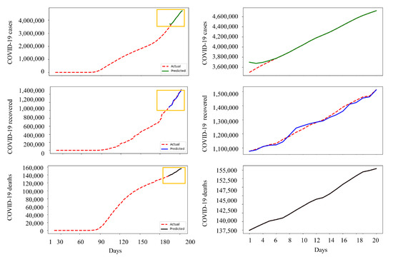 Here we discuss the prediction accuracy of the proposed method. The final fuzzy-rule based classification depended on death rate, case rate, and recovery rate. The suitable model chosen for each country was trained to predict these three values. We calculated root-mean-square error (RMSE) on the validation data to evaluate the methods. We compared using baseline algorithms such as linear regression, lasso linear regression, ridge regression. A single model was used to predict the values of all the countries. It is observed that such methods performed very poorly due to the small dataset. We also compared the method with some advanced neural networks such as a variation of LSTM combined with a fully convolutional network [55], a variation of residual RNN [56], and GRU [57]. It is also noted that very deep networks also failed to predict accurately using such a small dataset. Bayesian optimized shallow GRU performs closer to our method. The results are summarized in Table 3. Example results on USA trend prediction are shown in Figure 9 for numbers of active cases, recovered cases and deaths.