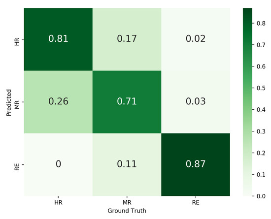 A fuzzy rule-based method was used to classify the risk of each country into three classes as discussed earlier (HR, MR, and RE). We predicted the risk classes for 25 days ahead. The accuracy was calculated in a state-of-the-art manner using a manual ground truth extracted from the trend data. Figure 10 shows the confusion matrix of the classification accuracy over 180 countries. It is observed that the method produced relatively lower accuracy of predicting MR class due to the incorrect trend rate prediction. We achieved 77.6% average accuracy over all the country-specific datasets. Table 4 lists a few countries that are classified as high risk, low, and in recovering stage based on the prediction of August 2020.