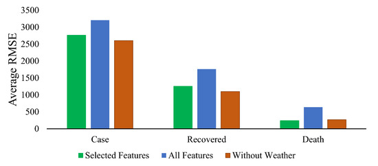 Average RMSE of total cases, recovered, and death using selected features, combined weather data, and without weather data on last 25 days prediction.