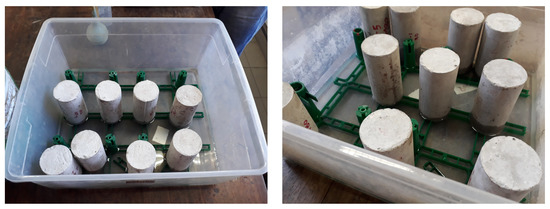 The capillary water absorption coefficients were measured according to UNE-EN 1015-18 (2003) [36]. The absorbed water under capillary action was obtained by leaving the bottom part of cylindrical specimens (having a diameter of 50 mm) in direct contact with water (Figure 2). The immersion depth was 5 mm. The measures were estimated by weighting the 50 × 100 cylindrical specimens before the immersion (0 h) and after immersion at 0.5 h, 1 h, 3 h, 7 h, 24 h and 48 h. No lateral sealant was used in these tests (as done in some other works in this matter, see [37,38]). All tests have been performed under controlled (constant) temperature and humidity laboratory conditions.