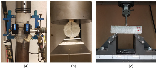 The Uniaxial Compression (Figure 3a) tests were performed following the ASTM C39-05 [41] standard procedures. Axial and circumferential strains were monitored with three Linear Variable Differential Transformers (LVDTs), all with a ±2.5 mm range. Four cylindrical specimens (50 mm diameter × 100 mm height) were analyzed per each mixture and temperature level. Tests were performed under different control steps. In the first stage, for axial stress values lower than 8 MPa, axial displacement control was applied with a rate of 0.24 mm/s. Then, circumferential strains control was applied until the end of the test, with a rate of 0.01 mm/s. Top and bottom faces of the cylindrical samples were polished using a GCTS grinder machine which led to the obtention of flat and parallel surfaces.
