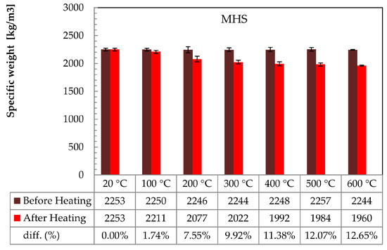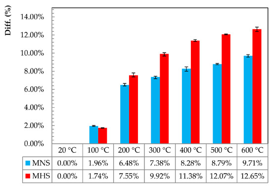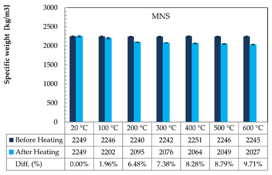 In Figure 4 and Figure 5 the weight loss after thermal treatments is presented for MNS and MHS, respectively. The histogram views report the specific weights of the sample before and after the heating (thermal conditioning). Also the values of the are addressed in these figures, where and denote the specimen weights before and after heating, respectively. In both figures, the error bars indicate the scatter of the results, highlighting the difference between the mean value and the min/max among four sample repetitions.