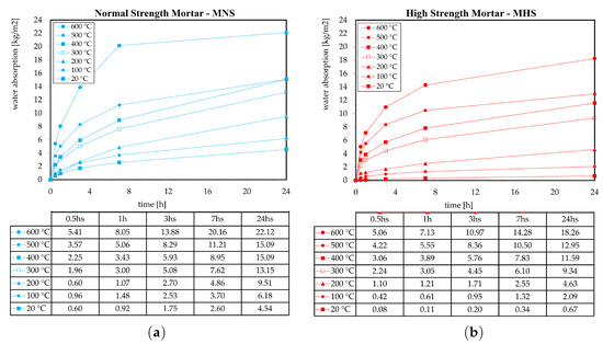 In this section physical properties related to water absorption are evaluated considering the two mortar types (MNS and MHS) at different high temperature levels. In this regard, Figure 7 presents the Capillary water Absorption (CA), in kg/m, of the two mortar mixtures measured at different time steps, in hours, and for different pre-conditioning thermal treatments, in degrees Celsius. The results in Figure 7 show that complete saturation was almost reached in 24 h all specimens. It can be observed in Figure 7a that CA-24 ranged from 4.54 (at 20 C) to 22.12 kg/m (at 600 C) by considering increasing temperature levels for the MNS samples, while in Figure 7b CA-24 ranged from 0.58 (at 20 C) to 18.26 kg/m (at 600 C) for MHS ones at increasing temperatures.