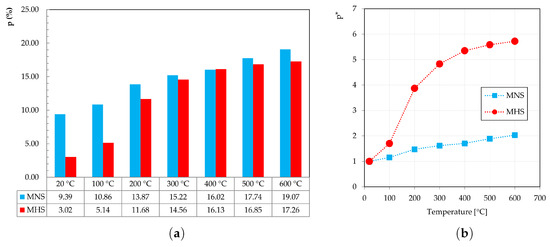 Finally, the values of accessible (open) porosity (p) evaluated as described in UNE-EN 1015-18 (2003) [36], are shown in Figure 8. Particularly, Figure 8a shows the p(%) values for both MNS and MHS at several temperature levels (20 C, 100 C, 200 C, 300 C, 400 C, 500 C and 600 C). The values of p(%) varied from 9.39% (at 20 C) to 19.07% (at 600) for MNS, and from 3.02% (at 20 C) to 17.26% (at 600 C) for MHS. As expected, the mixtures with higher ratio (i.e., MNS mixtures) are characterized by higher values of accessible porosity than those of lower ratio (i.e., MHS mixtures).