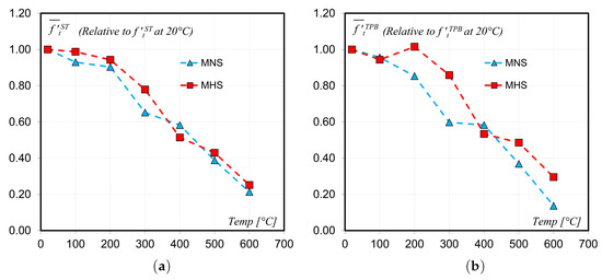 Evolution of indirect tensile strength with temperature corresponding to: (a) ST (Splitting Tensile tests) and (b) TPB (Three-Points Bending tests). Relative values with respect to the reference tensile strength at 20 C.