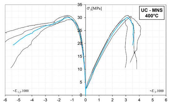 Uniaxial Compression—Axial stress vs. axial and lateral strains curves for Mortar MNS corresponding to a temperature of 400 C.