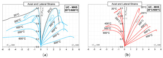 The mean axial stress vs. axial and lateral strains curves, with normalized stresses in terms of the peak stress at 20 C for all the considered temperatures are summarized in Figure 12, for MNS in the figure on the left side and for MHS, in the figure on the right one.