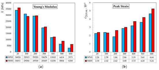 The damage caused by the action of increasing temperatures is evidenced not only by the decrease in peak stress, but also in the decrease of Young’s Modulus and in the increment of the absolute value of the axial strain corresponding to the peak stress. Plots in Figure 13 show the obtained values of those two properties. In particular, Young’s Modulus was obtained following ASTM-496-02 [45] as