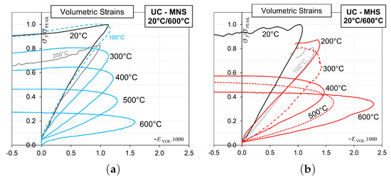 Uniaxial Compression—Mean axial stress vs. volumetric strains curves, normalized in terms of the peak stress at 20 C for all the considered temperatures for (a) MNS and (b) MHS.