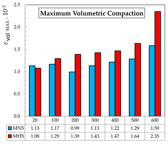It can be observed that cracks on the MNS specimens are inclined and distributed on the whole surface, while on the MHS sample, thin and almost vertical cracks can be seen. By comparing the MHS image with the SCC one, no sustancial difference can be appreciated. However, the maximum volumetric compaction achieved for the MHS, as depicted in Figure 15, was , while the corresponding to the SCC was [14], a fact that cannot be appreciated in the pictures.