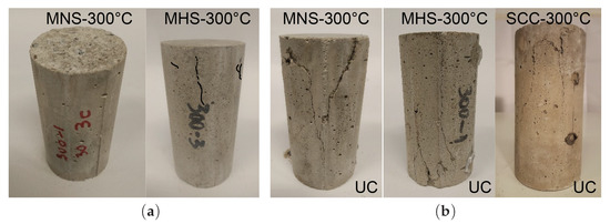 In turn, the three pictures on the right side of Figure 16 show sample images after the UC test of specimens thermally treated at 300 C. The first image corresponds to MNS, the second one to MHS, and the last one to a self-compacting concrete (SCC) analyzed in the frame of a previous experimental campaign (see [14]), having the same ratio of that of the MHS and with almost the same mixture, besides the coarse aggregates content.
