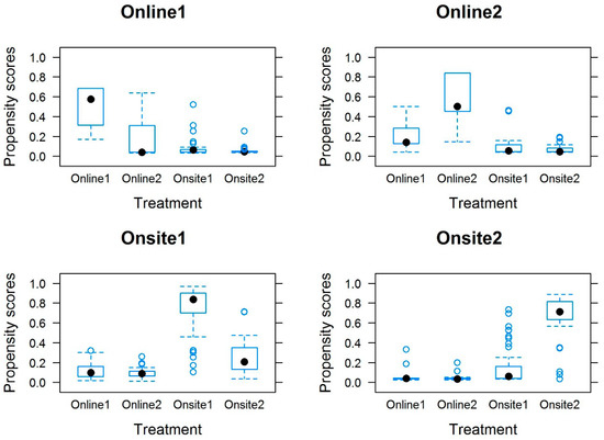 The IPTW model stabilized with 3000 iterations in all cases and, in the online groups, this convergence was more accentuated. There was no overlap between the coefficients of each group compared to the rest, which seems to indicate the presence of a large number of extreme values outside the common support area (
